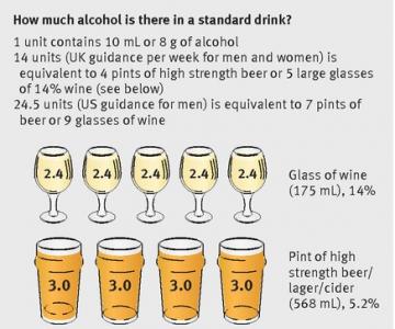 -la consommation médiane d'alcool s'élève (donc au Royaume-Uni) à 11,5 unités par semaine pour les hommes et 6,4 unités pour les femmes ;