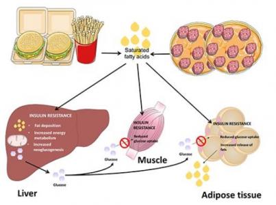 Une dose unique d'acides gras saturés (ici d'huile de palme) a un impact rapide et direct sur le foie et est suffisante pour déclencher une résistance à l'insuline. Ici, grâce aux nouvelles méthodes d'investigation, les scientifiques ont même pu constater que l'apport d'huile de palme affecte l'activité métabolique des muscles, du foie et des tissus adipeux. La résistance à l'insuline induite entraîne une nouvelle augmentation de la formation de sucre dans le foie avec une diminution concomitante de l'absorption de sucre dans les muscles squelettiques, un mécanisme qui entraîne l'augmentation de la glycémie. De plus, la résistance à l'insuline du tissu adipeux provoque une libération accrue de graisses dans le sang, ce qui favoriser encore la résistance à l'insuline.