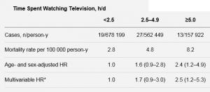 · les participants qui ont regardé régulièrement plus de 5 heures la télévision chaque jour ont un risque de décès par embolie pulmonaire multiplié par 2,5 vs ceux qui la regardent moins de 2,5 heures.