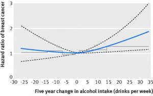 · les femmes qui ont augmenté leur consommation d'alcool de 2 verres par jour sur une durée de 5 ans augmentent leur risque de cancer du sein de 30%,