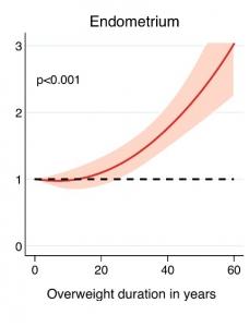 · La sévérité du surpoids vient renforcer ce lien est devenu en particulier pour le cancer de l'endomètre : chaque décennie supplémentaire passée avec un IMC > 35 est ainsi associée à une augmentation de 37% du risque de cancer de l'endomètre.