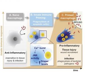 Cette recherche, fondamentale, menée sur la mouche à fruits a regardé précisément comment un type de cellule immunitaire, le macrophage, va lutter contre les infections ou autres lésions. L'équipe est parvenue à filmer de très courtes séquences du macrophage en pleine action, et, ce faisant, a fait une découverte impressionnante : avant de pouvoir passer à l'action, les cellules immunitaires doivent « s'activer » en « dévorant » une première cellule altérée. Ensuite, les cellules immunitaires sont alors en mesure de répondre à la lésion ou à l'infection.