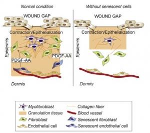 Les cellules sénescentes, impliquées dans la cicatrisation : car les cellules sénescentes sont en tout premier lieu les cellules de la peau -ou des cellules connexes qui jouent un rôle de soutien dans d'autres organes. Ces cellules ont perdu la capacité de se diviser et de se reproduire comme en réponse à une lésion ou à une maladie.