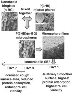 Ces films composites ont été immergés dans un fluide corporel pendant des périodes de 1, 3 et 7 jours afin d'étudier leur effet sur les fonctions cellulaires telles que l'adhésion cellulaire, la mobilité cellulaire et la différenciation cellulaire. Par microscopie électronique, les chercheurs observent au 3è et 7è jour, une surface rugueuse et irrégulière, propice à une meilleure adhérence et différenciation des cellules.