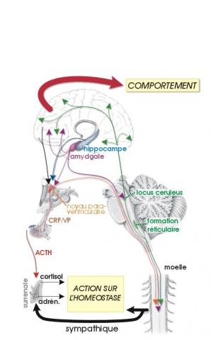 Dépression post-partum, un mécanisme encore mal compris : le stress est connu pour activer l'axe HHS, ce qui entraîne une réponse de lutte ou de fuite observée chez de nombreuses espèces. Cependant, pendant et après la grossesse, l’activation de l’axe HHS est moindre, afin de protéger la progéniture du stress. Par ailleurs, si de nombreuses recherches invoquent l’implication des hormones du stress sur le développement de comportements post-partum anormaux, les données cliniques chez les femmes souffrant de dépression post-partum restent contradictoires. À ce jour, la recherche n'a démontré ni le rôle de l'hormone corticotrope, impliquée dans la réponse au stress et principalement sécrétée par un groupe de neurones dans une zone de l'hypothalamus appelée noyau paraventriculaire, ni celui de l'activation inappropriée de l'axe HHS dans la dépression post-partum. Enfin, certaines études cliniques ont suggéré une relation entre l'hormone corticotrope, l'axe HHS et la dépression post-partum, mais d'autres ne sont pas parvenues à reproduire ces résultats.