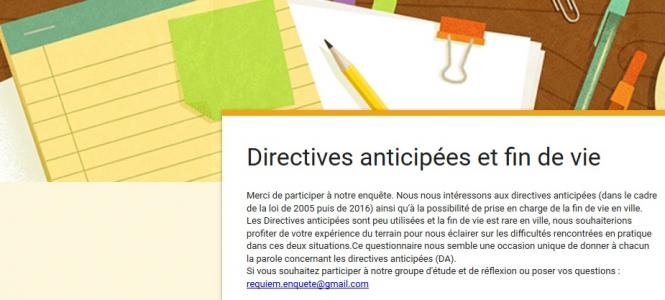 L'enquête a pour objectif de donner la parole au plus grand nombre possible de médecins généralistes, qui sont auprès des patients tous les jours, afin de mieux comprendre les limites pragmatiques à la mise en place des directives anticipées au sein de la prise en charge des patients, notamment en fin de vie, dans l'activité médicale quotidienne réelle.