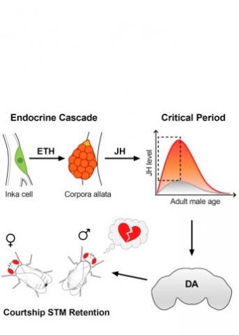 Les chercheurs montrent que chez un mâle Drosophila melanogaster, repoussé par une femelle déjà accouplée, l'état hormonal du corps est essentiel au maintien de ces tentatives infructueuses. 2 hormones sont requises dans le cerveau pour maintenir ces souvenirs : l'hormone déclenchante de l'ecdysie ou mue (ETH pour ecdysis triggering hormone) et l'hormone juvénile (JH pour juvenile hormone). De plus, le neurotransmetteur dopamine, impliqué dans la régulation des centres de récompense du cerveau, joue également un rôle clé. L'ETH s’avère essentielle pour la mémoire de ces tentatives de séduction (parade) par la régulation des niveaux de JH chez les mâles adultes.