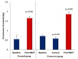 · La première étude, menée auprès de 48 femmes fibromyalgiques démontre une réduction des niveaux de douleur pour toutes les participantes, à l'issue d'un programme de 2 mois de traitement par l'oxygénothérapie hyperbare. Cette même étude identifie via IRM des marqueurs dans les zones du cerveau liées à la douleur fibromyalgique, ces changements significatifs d'activité cérébrale d'origine s'estompant avec le traitement par oxygénothérapie hyperbare.