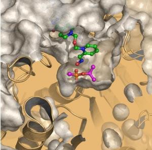 Une image du processus en 3D : après 7 années de recherche, les chimistes ont développé, grâce à des techniques de cristallographie aux rayons X et de calculs quantiques, une structure en 3D qui représente les quelques instants qui précèdent la rupture de la liaison entre l'agent neurotoxique et la protéine. Cette structure apporte une photo à haute résolution qui décrit en détail les positions de chaque atome et offre une nouvelle compréhension du processus d'empoisonnement. Le visuel ci-contre décrit ainsi comment le sarin et l'antidote HI-6 sont positionnés par rapport à la protéine acétylcholinestérase juste avant que l'antidote supprime le sarin et restaure la fonction de la protéine. Sarin en magenta, HI6 en vert, l'oxygène en rouge, du phosphore et de l'azote en orange en bleu.