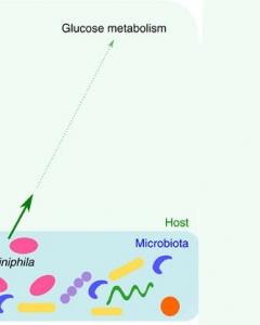 Une bactérie " clé ", médiateur immunitaire : l'exemple est donné avec cette bactérie clé du microbiote intestinal, Akkermansia muciniphila, -clé au point qu'elle a été conservée pendant des millions d'années d'évolution pour accomplir cette fonction chez les souris comme chez les hommes : quelle fonction ? Les niveaux de la protéine de IFN-y régule A.muciniphila - déjà documentée comme pouvant affecter le bon fonctionnement du métabolisme du glucose. Si IFN-y aide à lutter contre e multiples infections, une diminution de ses niveaux peut conduire à une amélioration du métabolisme du glucose. La recherche montre que,