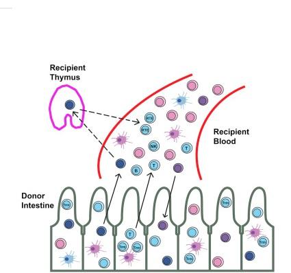 Les cellules sanguines du donneur peuvent aider la greffe chez le receveur : l'analyse des globules blancs en circulation chez 21 patients receveurs, montre que leur sang contient des cellules du donneur, issues des cellules souches hématopoïétiques de l’intestin greffé, et ces cellules de l'intestin du donneur peuvent être bénéfiques pour le greffé. En effet, plus un patient présente de cellules sanguines du donneur en circulation dans le sang, moins il est susceptible de rejeter sa greffe. Cette constatation d’un bénéfice pour le receveur et le succès de la greffe lié à la quantité de cellules sanguines du donneur suggère de nouvelles stratégies de gestion de la transplantation d'organes. Il est en effet possible, écrivent les chercheurs que ces patients greffés, avec un nombre élevé de cellules sanguines du donneur ne nécessitent pas autant d'immunosuppression. Ensuite, « ensemencer des organes greffés avec des cellules souches hématopoïétiques supplémentaires provenant du donneur pourrait également augmenter la tolérance de la greffe et améliorer considérablement la vie des patients transplantés.
