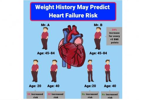On sait que les personnes atteintes d'obésité tout au long de leur vie encourent un risque plus élevé d'insuffisance cardiaque que les personnes qui ont pris du poids à un âge plus avancé. Cette analyse de la Johns Hopkins montre, via l’analyse de plus de 6.000 dossiers médicaux que le poids corporel d’un patient à 20 ans puis à 40 ans prédit relativement précisément son risque futur d’insuffisance cardiaque ou d’événement cardiaque majeur. Donc un petit test clinique simple, proposé dans le Journal de l'American Heart Association, qui peut être automatisé à partir des données du dossier patient, susceptible d'aider les médecins pour conseiller et traiter leurs patients âgés.