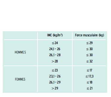 Un des marqueurs de l’obésité sarcopénique est la diminution de la force musculaire, facilement mesurable par un appareil dynamomètre appelé Handgrip, avec des abaques bien établies (cf. tableau).