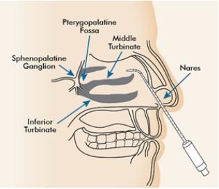 Ce traitement innovant cible sans aiguille mais avec un cathéter, le ganglion sphénopalatin, un faisceau de nerfs associé aux migraines et situé à l'arrière du nez, dans la joue près du nerf trijumeau. Le cathéter est inséré dans chaque narine et un anesthésique local est administré au ganglion sphénopalatin. L'anesthésique permet de désactiver le ganglion sphénopalatin, de réinitialiser le circuit en cause dans les maux de tête, d'interrompre ainsi le cycle de crises sévères de migraines et de réduire le besoin de médicaments. La technique, peu invasive entraîne un effet presque immédiat et permet un soulagement durable durant des mois. Bien évidemment, ce n'est pas un traitement de première ligne, en particulier pour les patients pédiatriques, qui ne sont admissibles à la thérapie qu'en cas de diagnostic avec migraine sévère ne répondant pas aux traitements standards.