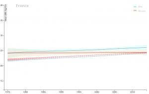 · l'IMC moyen global des hommes et des femmes augmente de l'équivalent d'un gain de poids de 1,5 kg par personne et par décennie. La France devrait suivre la tendance, pour les hommes seulement (Voir courbe ci-contre),