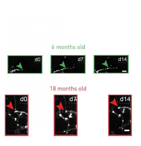 La chute brutale de « l’indice de dynamisme » : dans l'étude, les chercheurs se sont concentrés sur le vieillissement des interneurones inhibiteurs, moins bien compris que celui des neurones excitateurs, mais au rôle clé dans la plasticité -essentielle pour l’apprentissage et la mémoire et pour l’acuité sensorielle. Les chercheurs se sont concentrés sur le cortex visuel. L’équipe a dénombré et suivi de façon chronique la structure des interneurones inhibiteurs chez des dizaines de souris âgées de 3, 6, 9, 12 et 18 mois et montre que les interneurones inhibiteurs conservaient la capacité de se remodeler dynamiquement à l'âge adulte, mais qu’en revanche, la plasticité atteint une limite puis décroît progressivement à partir d’environ 6 mois. Ainsi, entre 3 et 18 mois, les dendrites se simplifient progressivement présentant moins de branches et cela, avec une chute brutale de « l'indice de dynamisme » : à 3 mois, pratiquement tous les interneurones sont supérieurs à un indice crucial de 0,35, mais à 6 mois c’est le cas seulement de la moitié et à 18 mois, il « n’en reste aucun ».