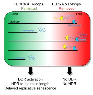 Les chercheurs découvrent « TERRA », une espèce d'ARN qui s'accumule spécifiquement aux extrémités des télomères en état critique, se lie directement à l'ADN et signale à la cellule que ces télomères doivent être réparés, permettant ainsi à la cellule de poursuivre sa division. TERRA s’avère donc être un système de réglementation complexe qui explique comment les télomères courts sont identifiés par la cellule. L’équipe, qui a examiné la régulation de TERRA dans le cycle cellulaire, constate que les niveaux de TERRA sont différents aux différents stades du cycle cellulaire. Ils montrent aussi que le cycle d'accumulation de TERRA est différent entre les télomères courts et les télomères longs. Enfin, ils montrent que TERRA s'accumule réellement sur tous les télomères, mais lorsque les télomères sont encore longs, TERRA est rapidement éliminée avec l'aide des protéines Rat1 et RNase H2. Ces protéines se lient préférentiellement aux longs télomères et veillent à ce que TERRA soit éliminée, mais ne sont pas présentes dans les télomères critiques, ce qui signifie que TERRA y reste plus longtemps. Ce mécanisme assure la réparation ultérieure du télomère court, qui est crucial pour que la cellule de survive et se divise.