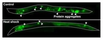 Un stress modéré peut protéger contre d'autres types de stress : les chercheurs montrent ici qu'un stress thermique modéré permet d'améliorer la capacité des vers à gérer d'autres stress en particulier liés à l'âge : c'est le cas de l'accumulation de protéines agrégées, un phénomène stressant pour les cellules. Chez le ver modèle de la maladie de Huntington, un trouble causé par des anomalies de pliage des protéines neuronales et la formation de touffes, l'exposition à un choc thermique léger permet de réduire le nombre d'agrégats toxiques. Qu'une rapide exposition à la chaleur puisse atténuer l'agrégation des protéines est un phénomène remarquable car de nature à conduire à de nouvelles approches thérapeutiques contre les maladies neurodégénératives telles que la maladie de Huntington, d'Alzheimer et de Parkinson.