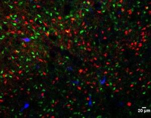Un récepteur nommé mGluR5 : L'équipe constate ici que le blocage d'un récepteur du cerveau appelée mGluR5 rétablit l'équilibre de l'activité entre ces cellules dites "go" (rouge) et les cellules qui inhibent l'action ou « no go » (en vert sur visuel ci-contre). La suractivité de ce récepteur mGluR5, dans le striatum, une zone du cerveau impliquée dans les comportements compulsifs apparaît ainsi comme le principal moteur des comportements anormaux.