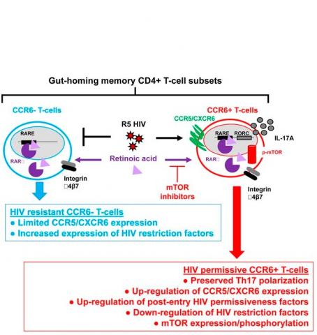 Le tube digestif est un environnement propice aux réservoirs viraux : la recherche démontre que les cellules T CD4 qui migrent du sang vers l'intestin sont modifiées. En route, elles acquièrent les outils qui aident le virus à les infecter. L'identification de ces outils peut permettre de comprendre pourquoi l'intestin représente un environnement favorable au VIH, et donc le modifier à dessein. Les chercheurs montrent que les cellules T CD4 migrent du sang vers l'intestin grâce à certaines molécules marqueuses exprimées à leur surface, dont CCR6, qui agit comme une sorte de code postal pour les cellules et les dirige vers l'intestin. Les cellules qui expriment CCR6 sont donc des cibles préférentielles. Ici, par biopsies du côlon et du sang de personnes infectées par le VIH et sous TARV, les chercheurs constatent que les cellules T CD4, dans le colon, qui expriment CCR6, contiennent également une grande quantité d'une autre molécule, mTOR, un régulateur important des mécanismes métaboliques. En fait, la molécule mTOR s’avère en partie responsable de la forte vulnérabilité au VIH des lymphocytes CD4 T exprimant CCR6 et résidant dans l'intestin.