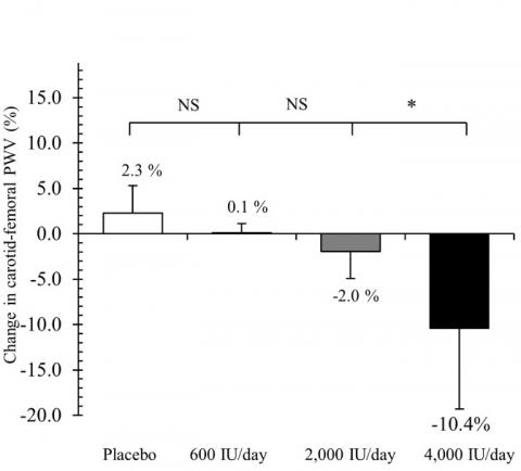 - la dose la plus élevée (mais considérée comme sûre) -soit 4.000 U.I. de vitamine D- a réduit la rigidité artérielle de 10,4% en 4 mois.