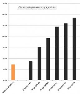 Les chercheurs de l'Imperial College London, de l'Arthritis Research UK et de l'Université d'Aberdeen ont effectué une méta-analyse des données de 19 études menées au total sur près de 140.000 adultes. Par extrapolation de ces résultats, ils parviennent à l'estimation suivante : près de 43% des adultes souffrent de douleurs chroniques. Et plus on avance n âge, plus ce risque -logiquement- augmente : ainsi, au-delà de 75 ans, le risque de douleur chronique est de 62% vs 14,3%, dans la tranche d'âge de 18 à 25 ans (Voir schéma ci-contre).